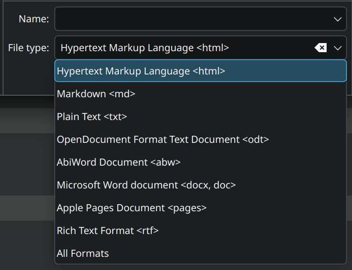 Bellow is a screenshot listing all the formats supported by QPrompt’s 2.0, most of which are imported through LibreOffice. Formats include: DOC, DOCX, RTF, ODT, ABW, Pages, Markdown, plain text, and HTML.